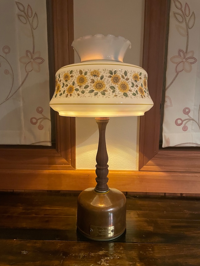 ビンテージのヒマワリ柄ミルクガラスシェードです。 ミルクガラスに綺麗なフローラル柄で、柔らかい明るさと雰囲気が素敵なシェードです。 写真のように38灯でも使えますが、加圧式のテーブルランプにももちろん使えます。 直径最大約21センチ 上部直径14.5センチ 高さ14.5センチ