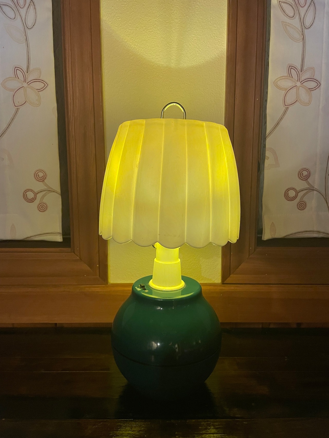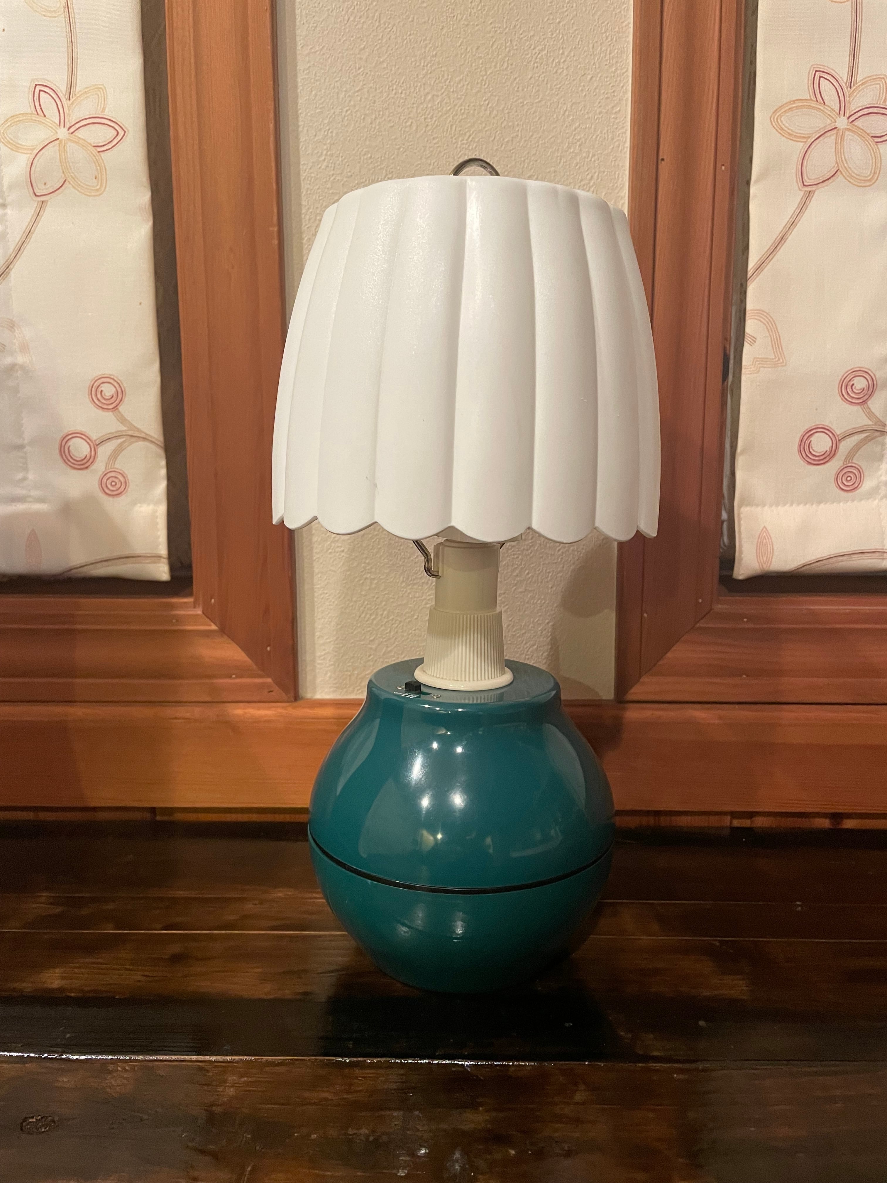 プリーツ状のプラスチックシェードと、深いグリーンの丸型ベースが特徴的なデザインで、キャンプギアでありながら家庭用ランプのような温かみがあります。なおシェードの固定部が一部ダメージがあります。(写真6枚目)