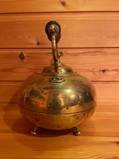 真鍮の本体と木製ハンドル、可愛らしい脚が付いたケトルです。