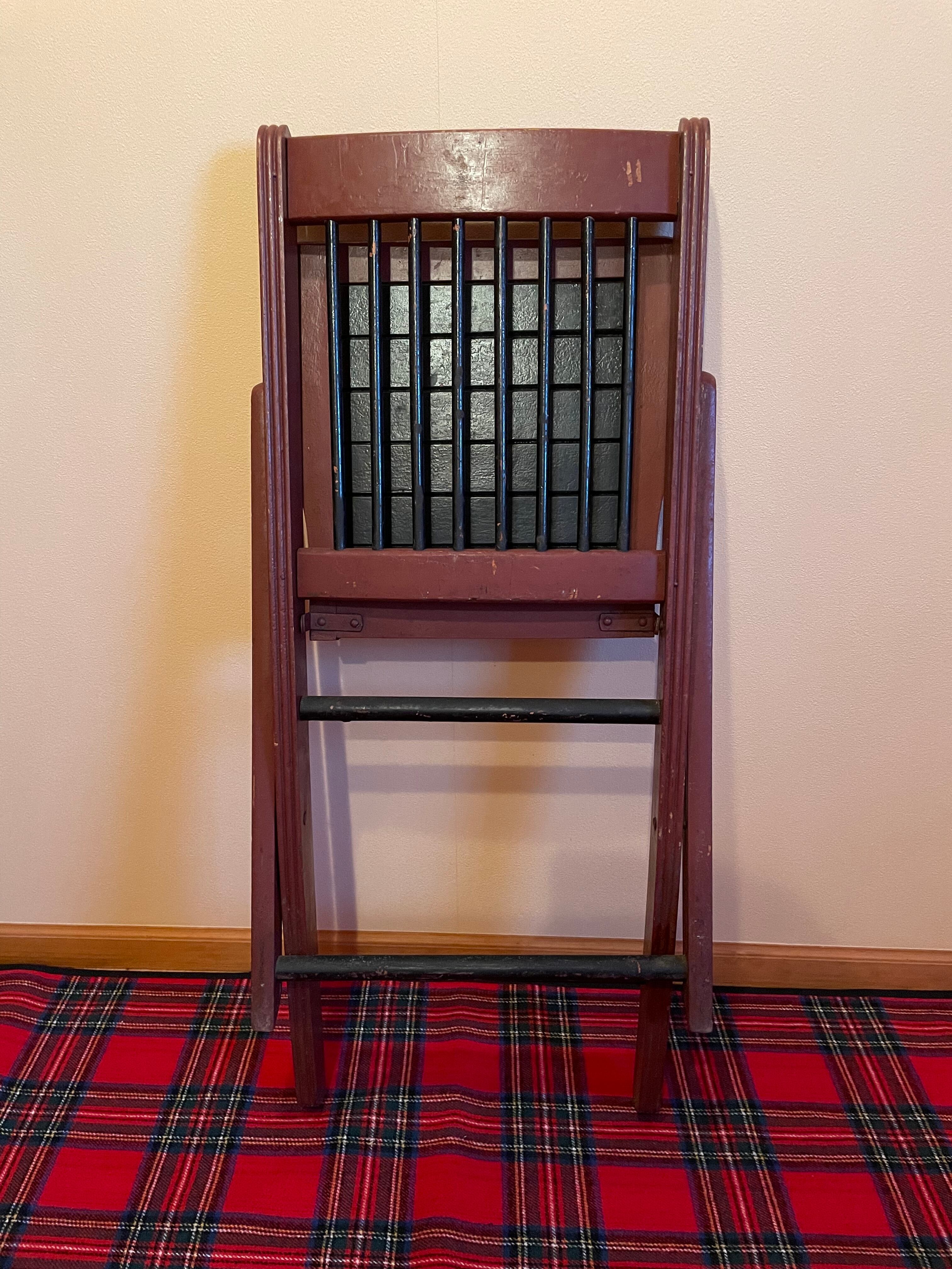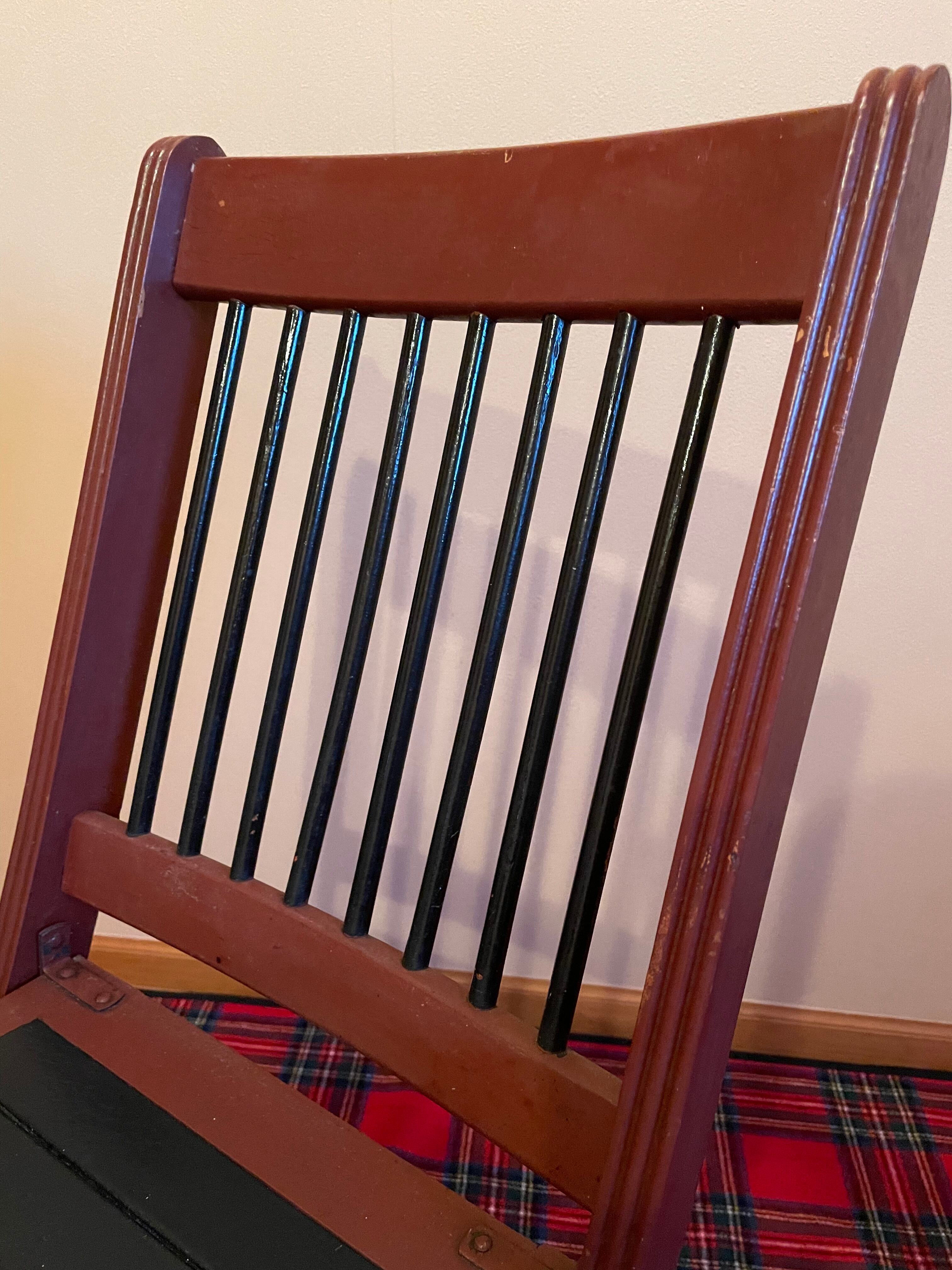 赤茶色と黒に塗装された木製の座面と背もたれは、古き良き時代を感じさせます。
