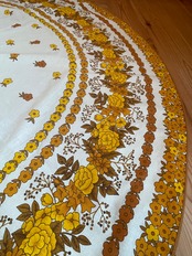 このサークルタイプでフラワーアレンジのテーブルクロスは珍しく、オレンジ基調もとてもオールドスタイルにマッチするかと思います。
