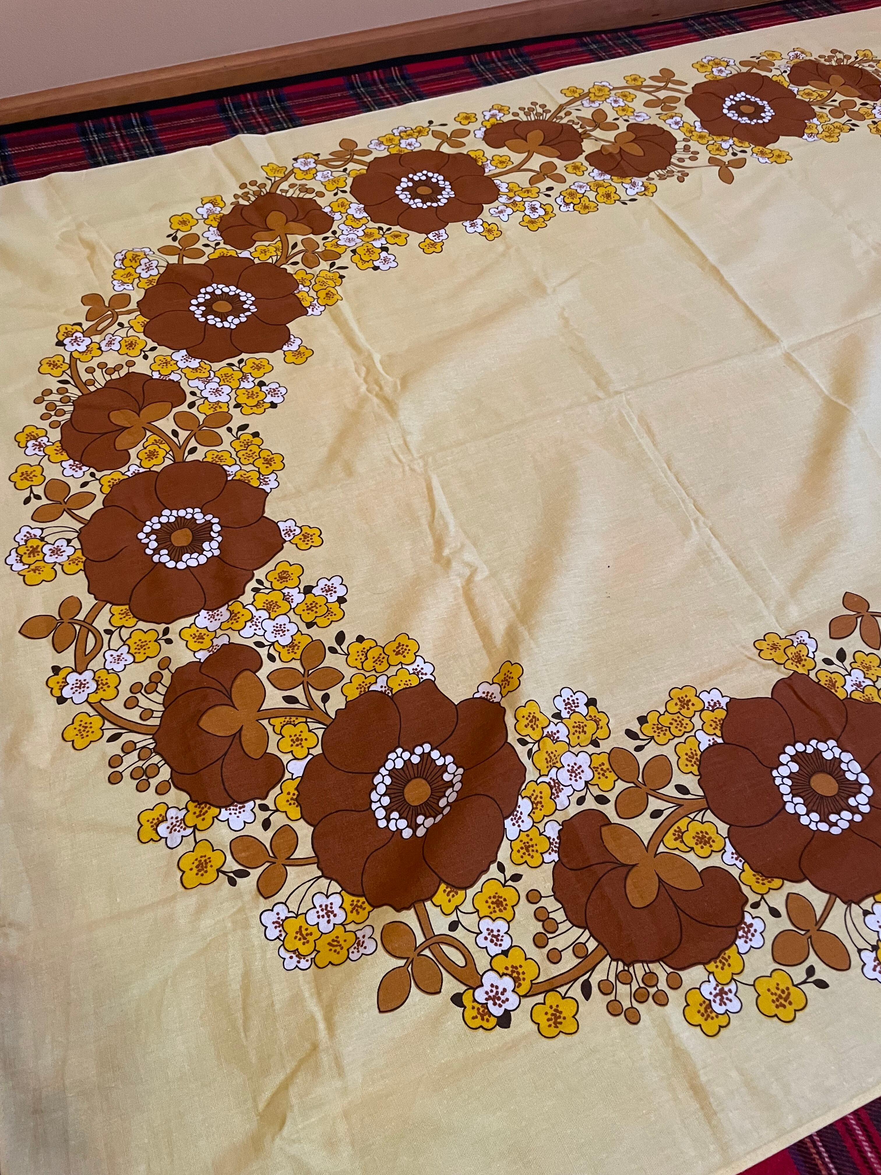 Vintage 70s Yellow Brown Retro Floral Tablecloth