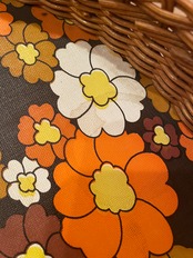 木製ベース、エッジは籐、内側にレトロフラワーデザイン(ビニール)となっています。