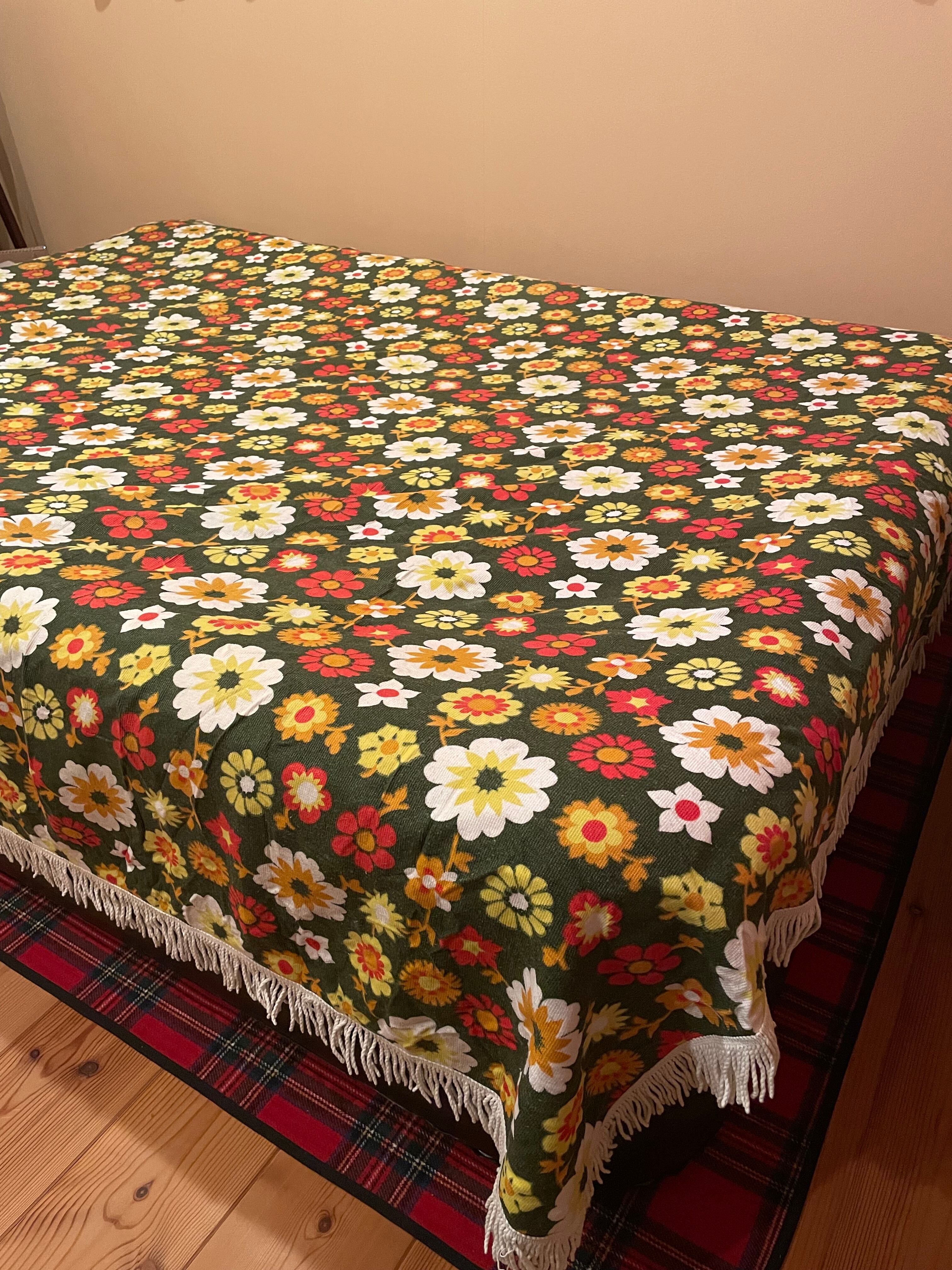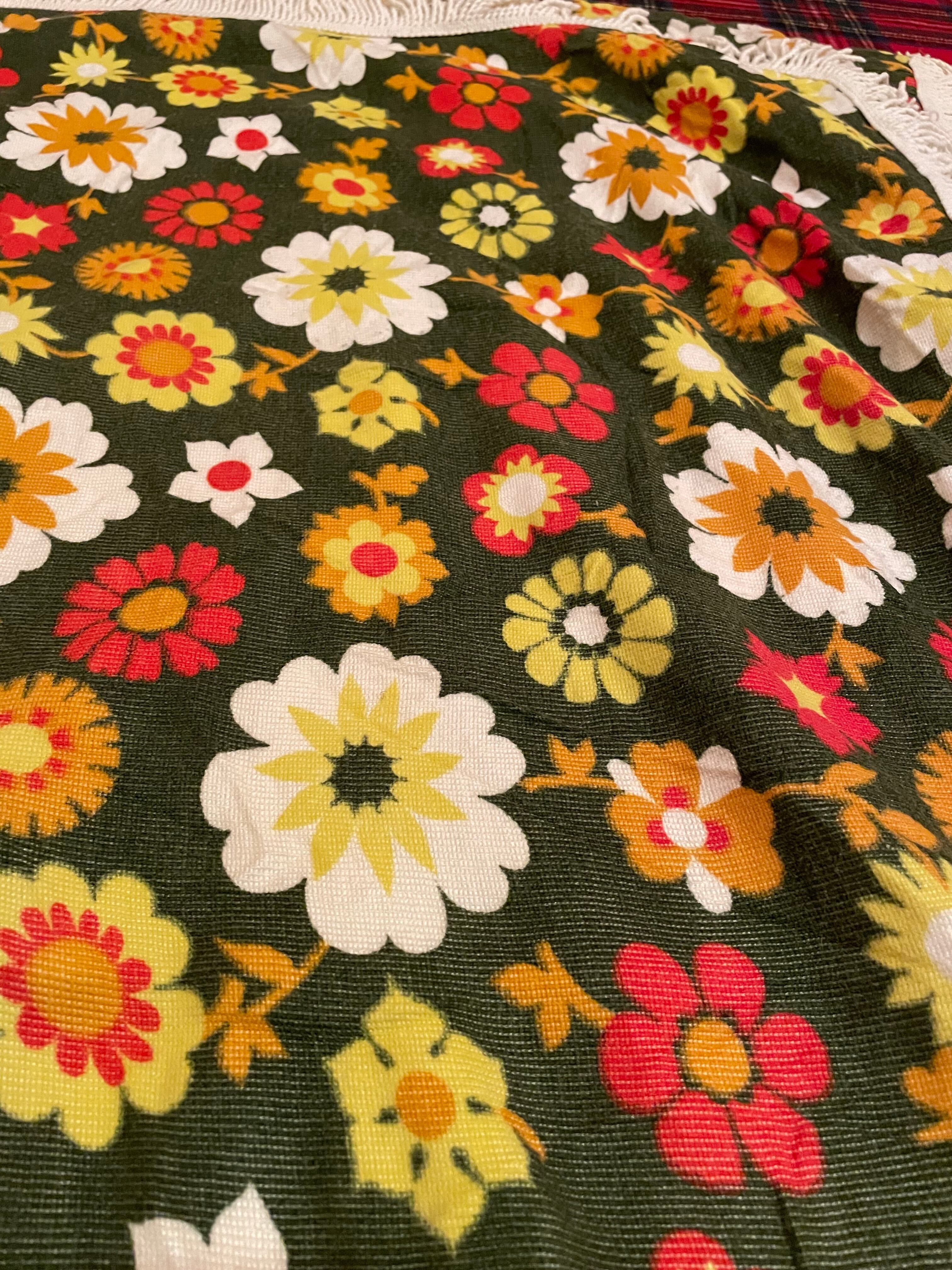 グリーンベースに鮮やかで様々な色合いのフラワーデザイン。とても可愛らしいビンテージです。