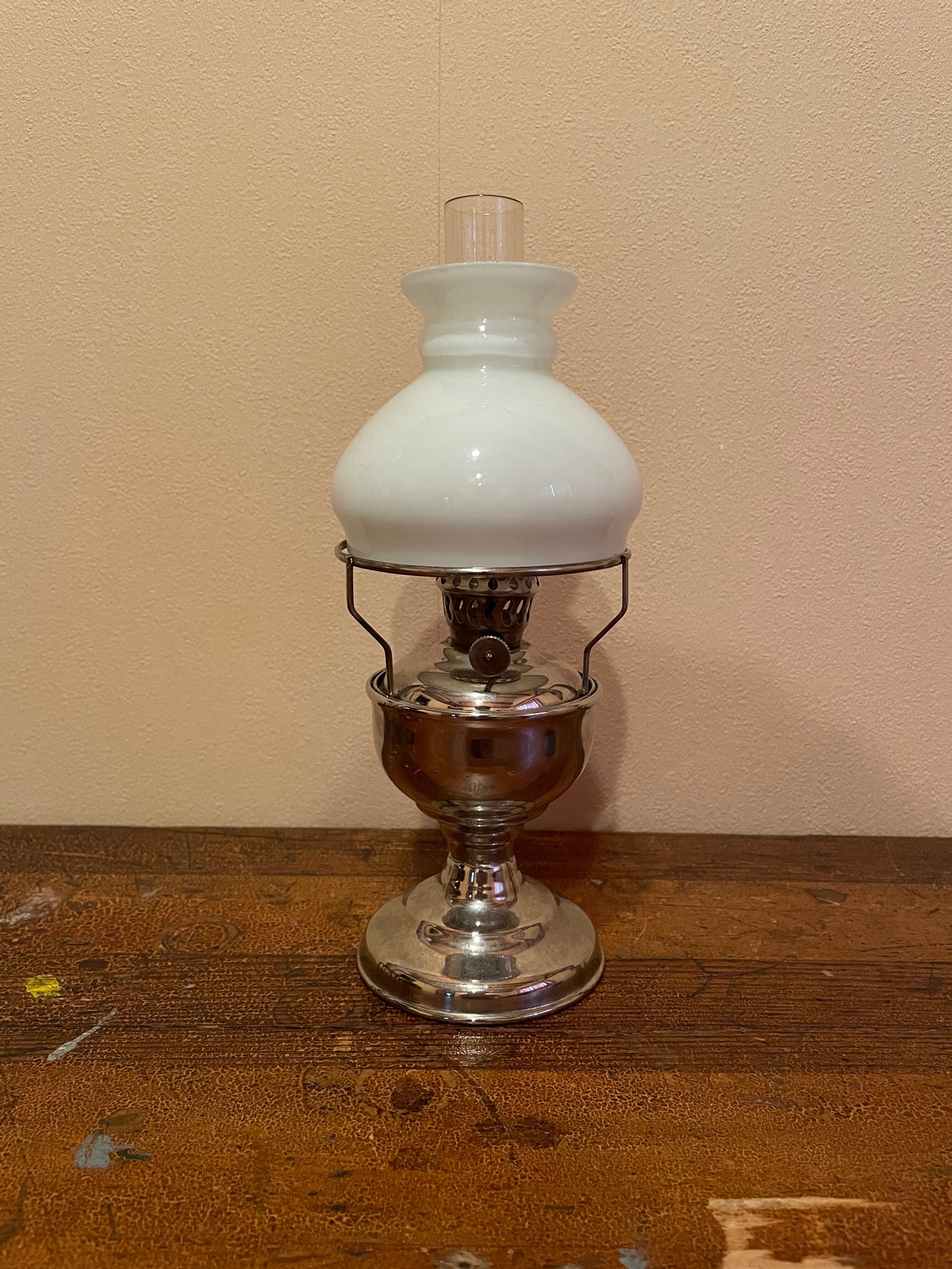 ミルクガラスのホヤがとても柔らかい雰囲気を醸し出します。やはり安価なランプとは違い、その灯りと雰囲気はさすがのイングランド製ということろです。