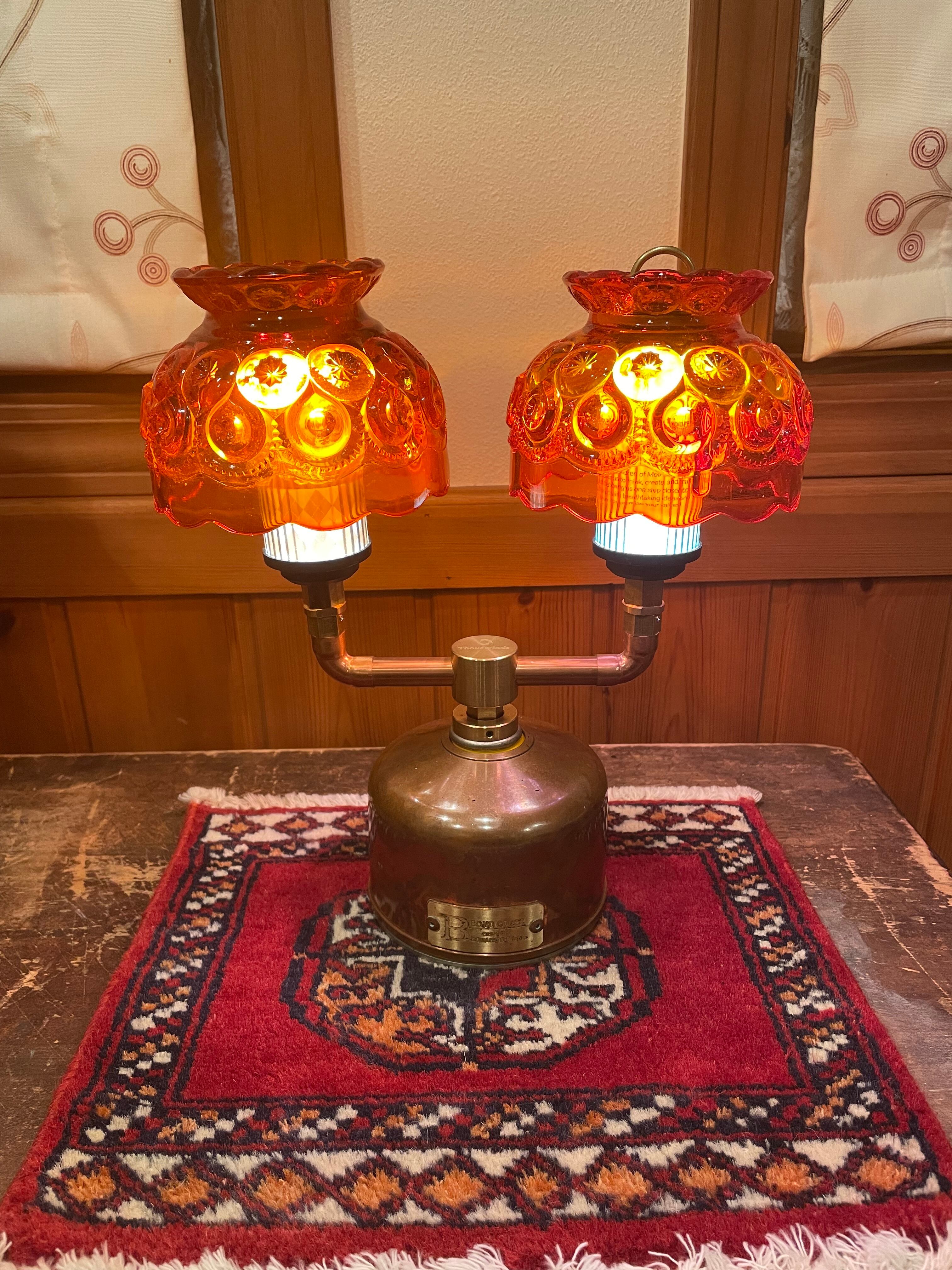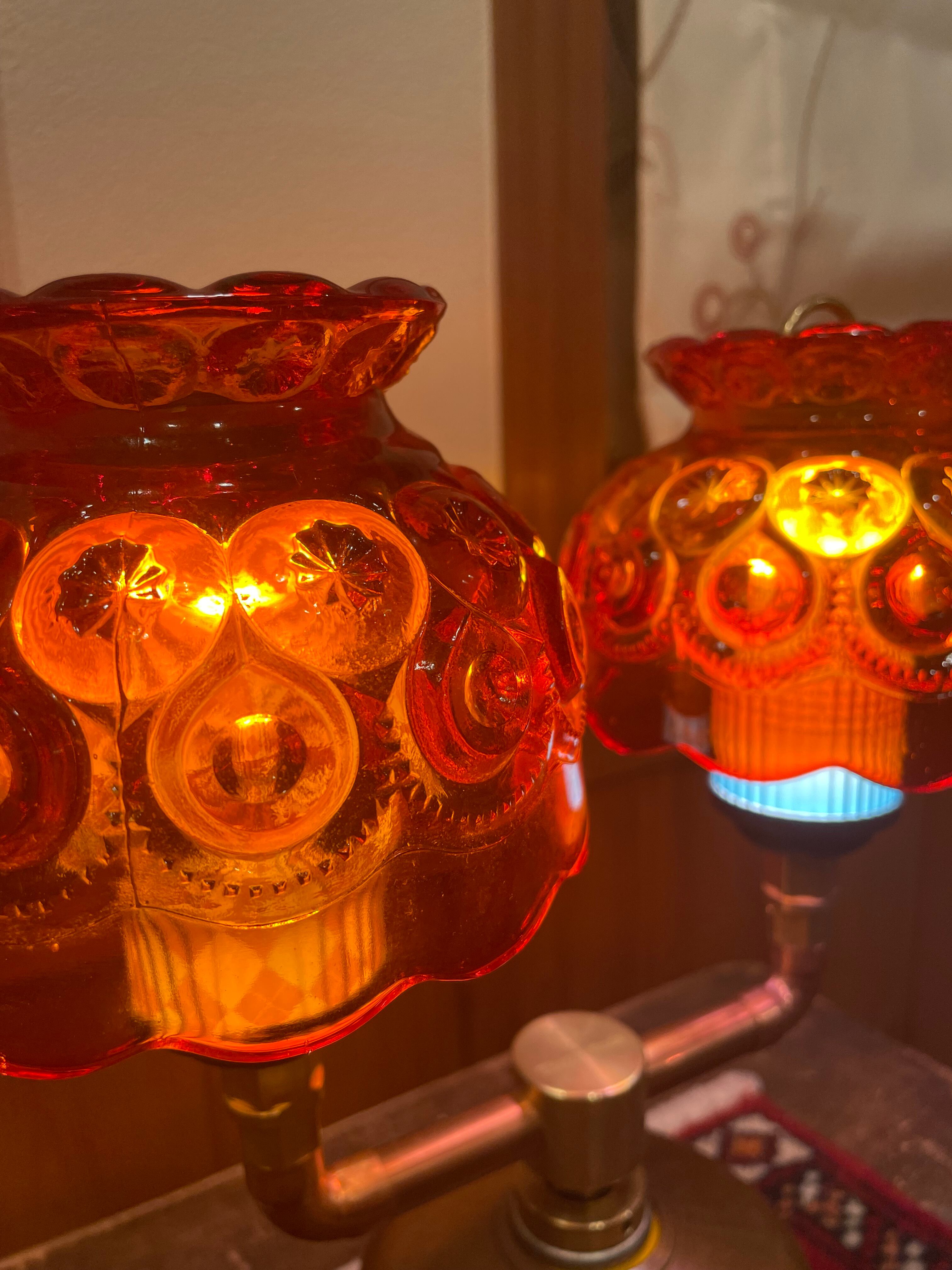 このパターンは、月と星を象徴するような立体的な凹凸模様で、どの角度からも輝きを見せるよう工夫されていました。クラシカルで華やかなデザインは当時のアメリカで大変人気を博し、中でも人気のランプシェードは光が中から溢れることで模様が浮かび上がるため、特に夜間のリビングに華を添えました。